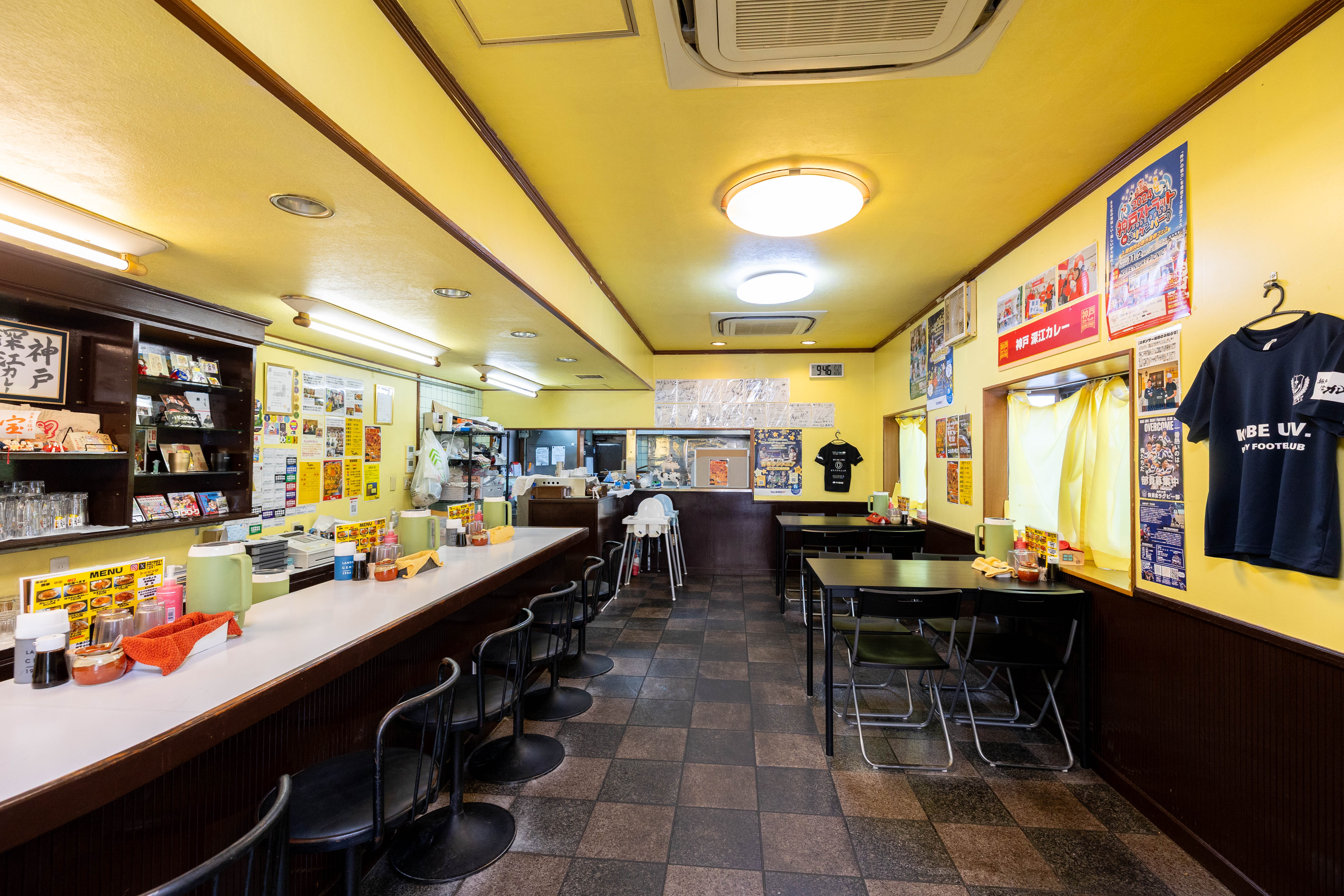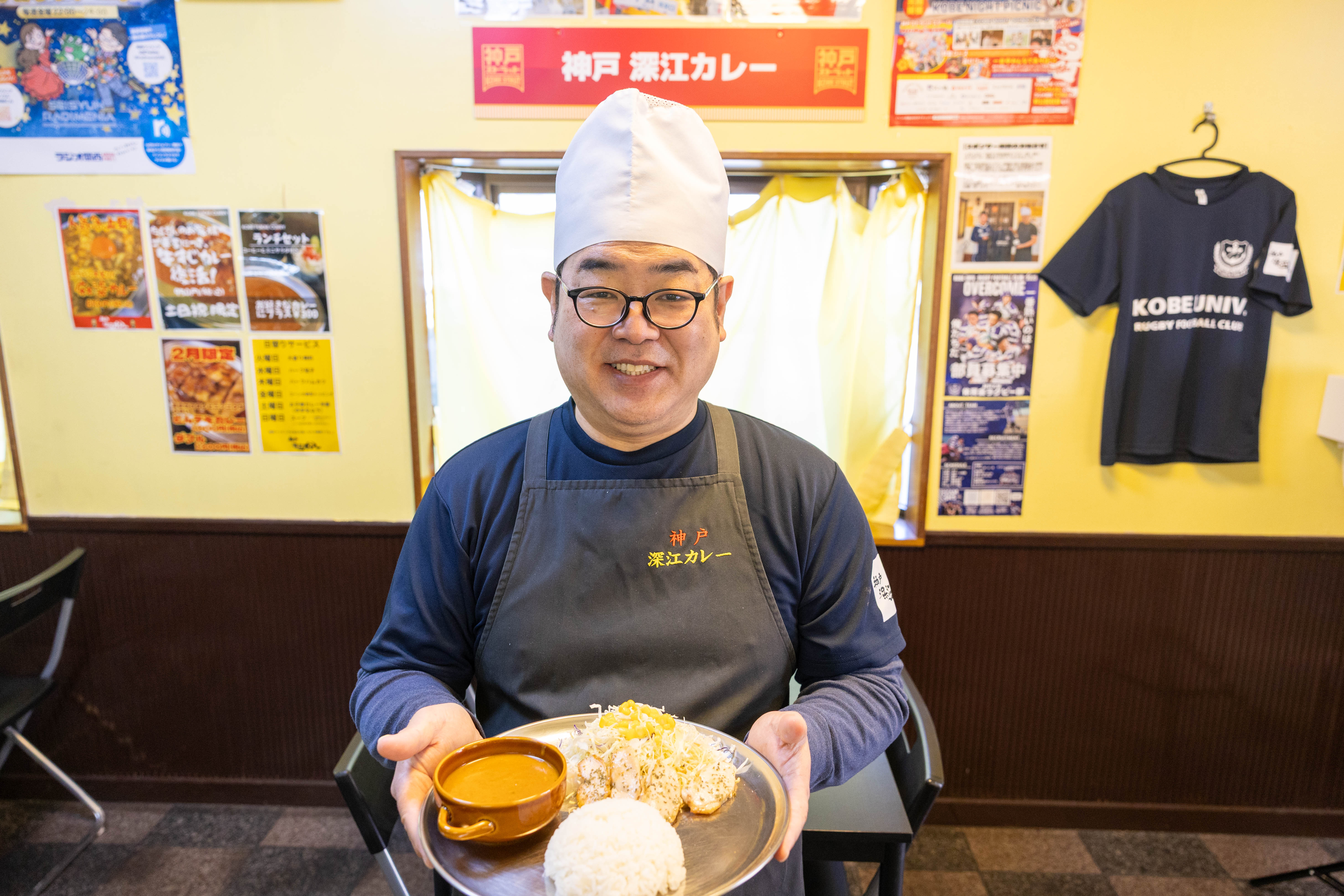 阪神深江駅から徒歩約6分。遠くからでも目立つ黄色の看板と幟が目印。神戸大学ラグビー部をはじめ地域の、雰囲気のカレー専門店です。